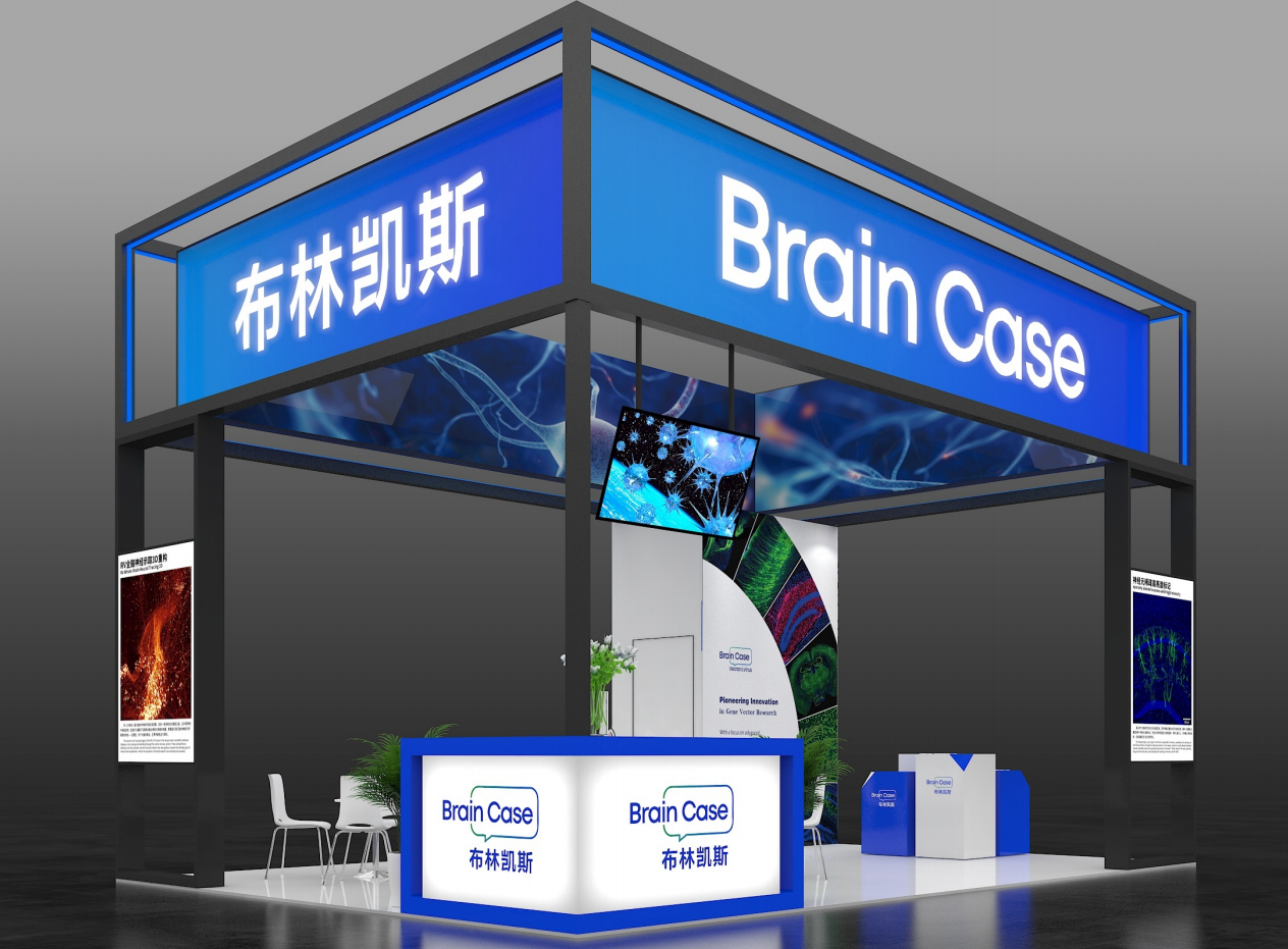 站在布林凯斯T9展台前,蓝白主色调的立方体结构和“Brain Case” 与 “布林凯斯” 的醒目灯箱门头,配上整体的黑色钢筋框架,科技感十足,瞬间抓住眼球。