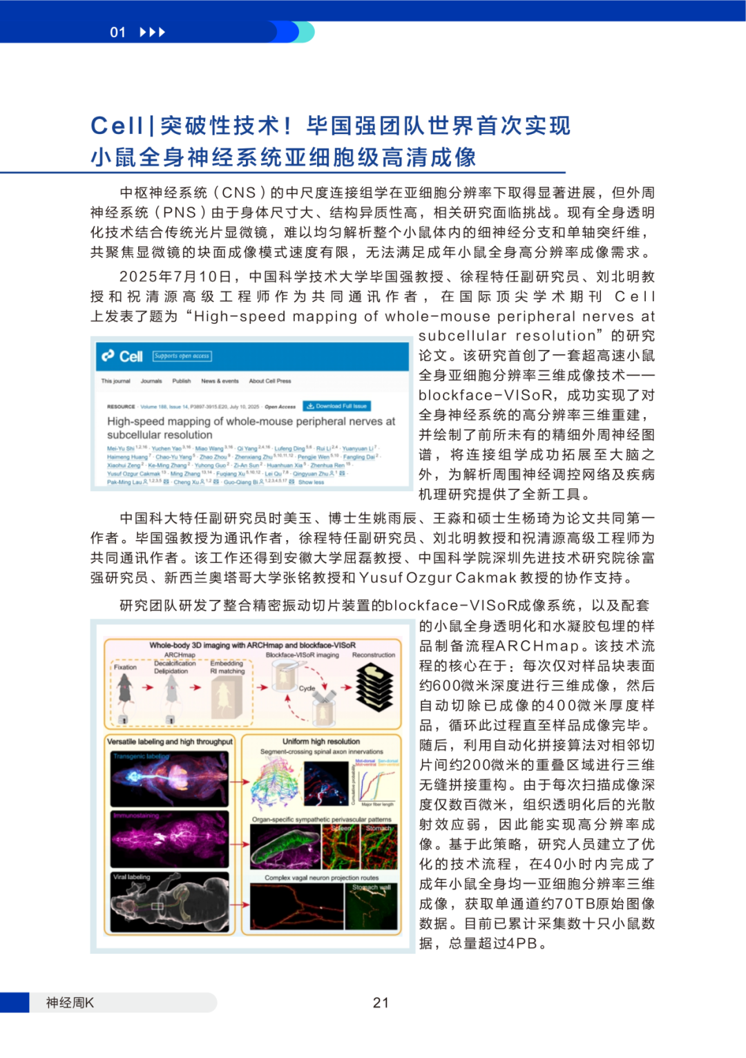 中科大毕国强团队首创 “blockface-VISoR” 技术,成功实现了对全身神经系统的高分辨率三维重建,首次绘制精细外周神经图谱;