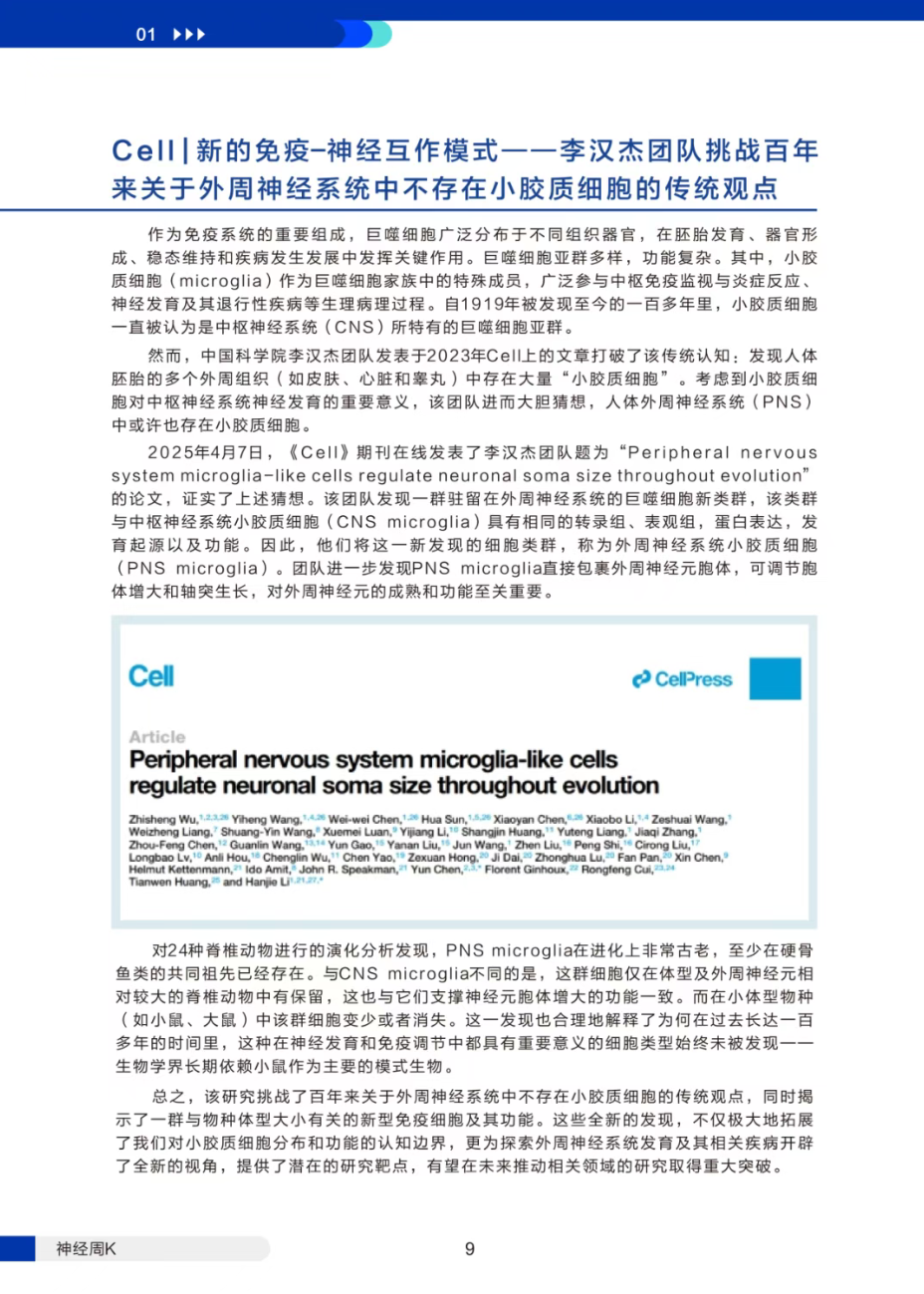 中科院李汉杰团队在 Cell 发表突破性研究,挑战了 “小胶质细胞仅存在于中枢神经系统” 的百年观点!他们在人、食蟹猴等大体型脊椎动物的外周神经节中,发现了与中枢小胶质细胞同源的 “PNS microglia”,这类细胞能包裹外周神经元胞体,调控神经元成熟 —— 这一发现彻底拓展了小胶质细胞的研究边界。