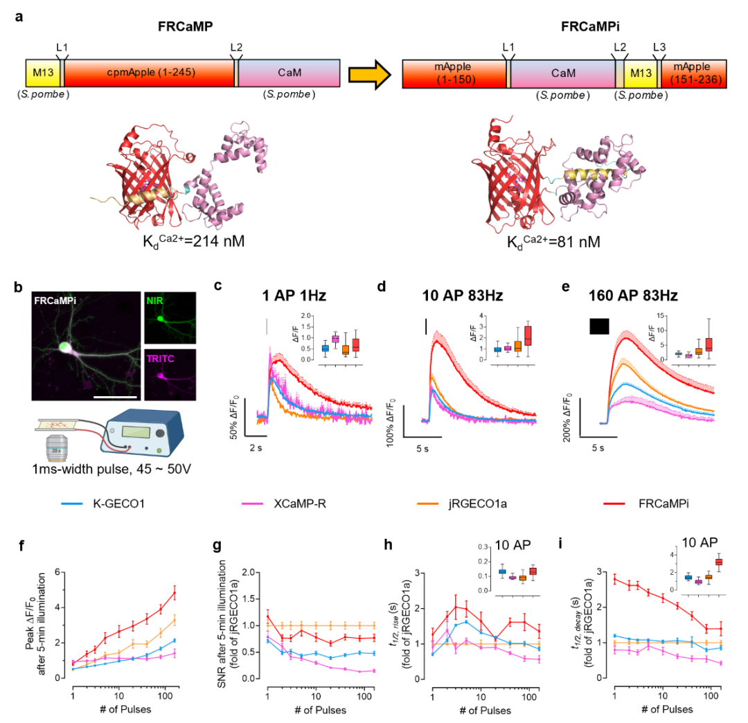 图2 FRCaMPi的设计及其在原代小鼠海马神经元中的特性表征