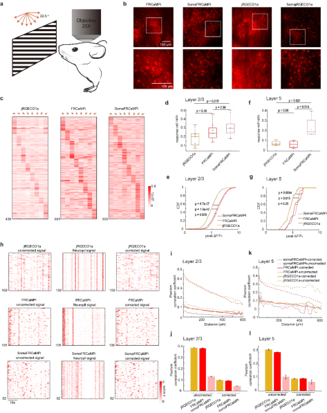 后续,作者利用双光子显微镜对小鼠初级视觉皮层(V1)神经元群体进行了钙成像。SomaFRCaMPi 在细胞体定位上表现出色,能够显著减少神经纤维的荧光干扰,而SomajRGECO1a则体现出明显毒性。视觉光栏刺激下,SomaFRCaMPi载L2/3层中检测到的平均神经元数量(58.1 neurons/FOV)较jRGECO1a(21.9 neurons/FOV)提升2.6倍。与 jRGECO1a 相比,SomaFRCaMPi 的峰值 ΔF/F0 幅度高出至少 77%,总体响应细胞数增加了50%。信号相关性(Pearson系数)在未校正神经纤维信号时降低2-7倍(不同距离范围上)。此外,SomaFRCaMPi 在长期表达(4个月)后仍能保持较高的灵敏度和稳定的信噪比。同时在深层皮层(L5),SomaFRCaMPi也体现了类似的高峰值和低信号相关性。由此可见,SomaFRCaMPi 能够在深部脑区实现高灵敏度、高信号提取和低神经纤维干扰的稳定神经元活动检测,是双光子在体成像的高性能红色GECI。(图6)