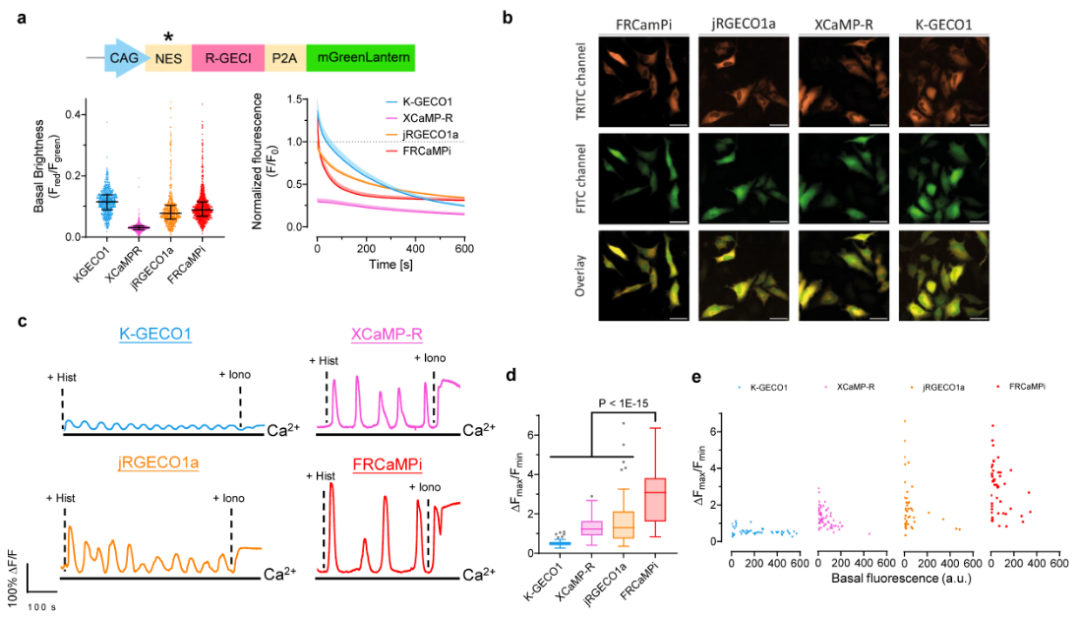 首先,通过对初代 FRCaMP 的拓扑结构进行“反转”处理,开发出了一种新的红色基因编码钙指示剂 FRCaMPi。通过把mApple从与初代的 FRCaMP 相比,FRCaMPi 的钙结合亲和力提高了约三倍,在神经元中初检测的峰值荧光是前体 FRCaMP 的 2.36 倍。在海拉细胞与培养的海马神经元实验中,FRCaMPi 相较于 jRGECO1a 拥有更高的灵敏度和更宽的动态范围(图1,图2)。同时,FRCaMPi 在体内光纤成像验证中展现了长达3个月的可靠稳定性与适用性。