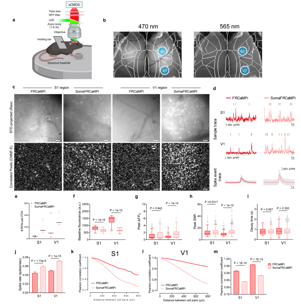 最后,作者在清醒小鼠的初级体感皮层(S1)和视觉皮层(V1)中利用单光子宽场显微镜测试了 SomaFRCaMPi 的性能,并发现其相较于 FRCaMPi 在多个方面表现出显著优势:皮层神经元被高密标记时(80-90%),SomaFRCaMPi 能够检测到均值3.3倍于FRCaMPi的神经元ROI,同时SomaFRCaMPi观测到的钙事件数量较FRCaMPi增加50%,并且在峰值信噪比(SNR)上分别高出 10% 和 40%。更重要的是,在更高的神经元密度和平均更多钙事件的前提下,SomaFRCaMPi 仍能有效降低神经元间活动的相关性,尤其是在长距离(800 µm)范围内,相关性比 FRCaMPi 低20%-30%。这些结果表明 SomaFRCaMPi 在单光子宽场成像中的高效应用,降低了噪声,提升了检测数量以及信号的灵敏度和准确性。(图8)
