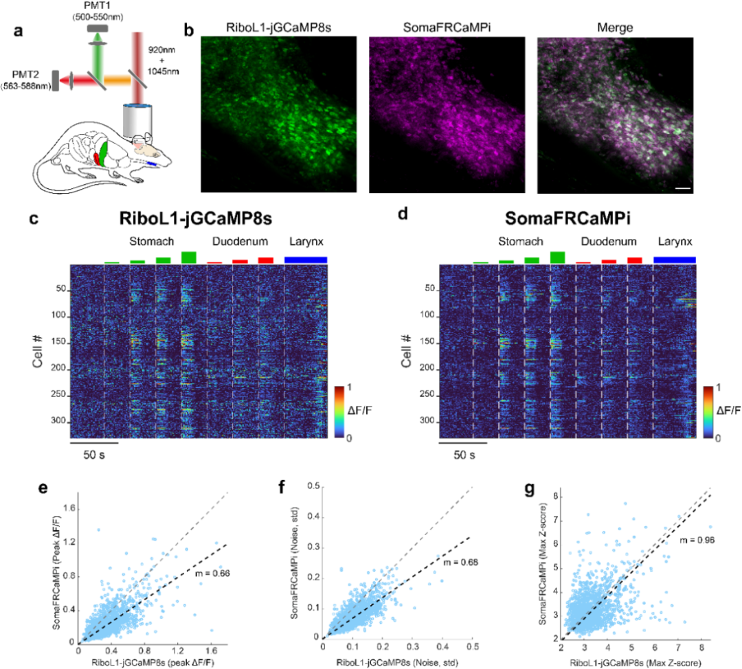 为了进一步评估 SomaFRCaMPi 是否能够与高性能绿色探针相匹敌,作者将 SomaFRCaMPi 与绿色胞体定位的 RiboL1-GCaMP8s(已知灵敏度最高的绿色GECI之一)共同表达于小鼠脑干孤束核(NTS)。在消化道扩张刺激下进行双色双光子成像结果表明,SomaFRCaMPi 在该高密度神经元区域依旧保持了清晰的群体荧光信号,且噪声水平更低,Z-score 信噪值与RiboL1-GCaMP8s近乎一致。这意味着 SomaFRCaMPi 的灵敏度已经可以比肩最好的绿色胞体定位GECI,并充分体现了利用红色波段的成像优势。(图7)