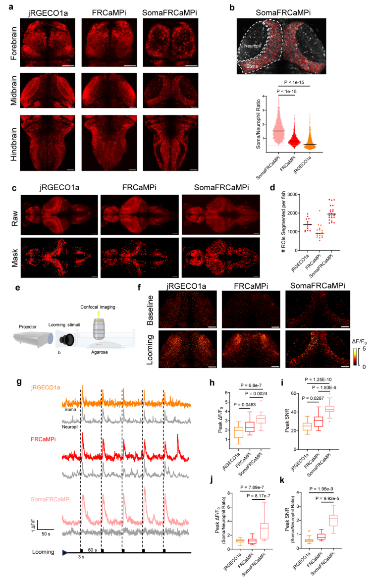 在体实验中,作者先通过转基因斑马鱼模型(全神经元表达)测试了 SomaFRCaMPi 的性能,并与非靶向的 jRGECO1a 和 FRCaMPi 进行了比较。结果表明,SomaFRCaMPi 的荧光信号局限于胞体区域,并在细胞分割方面表现出显著数量优势,用Cellpose自动分割后,SomaFRCaMPi可识别神经元数量较FRCaMPi提升2倍。在细胞体定位和信号响应方面,SomaFRCaMPi细胞体与神经纤维的荧光比是非靶向指示剂的两倍以上,且在逼近视觉刺激下,其峰值 ΔF/F0 和信噪比(SNR)显著优于其他指示剂,且神经纤维信号响应降低了3倍。这些结果展现了SomaFRCaMPi在斑马鱼钙成像中对神经元群体中胞体信号提取的显著应用优势。(图5)