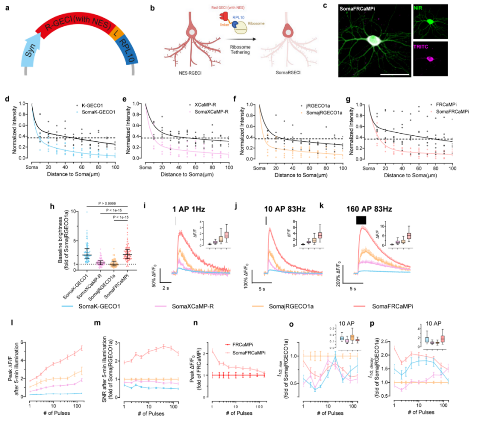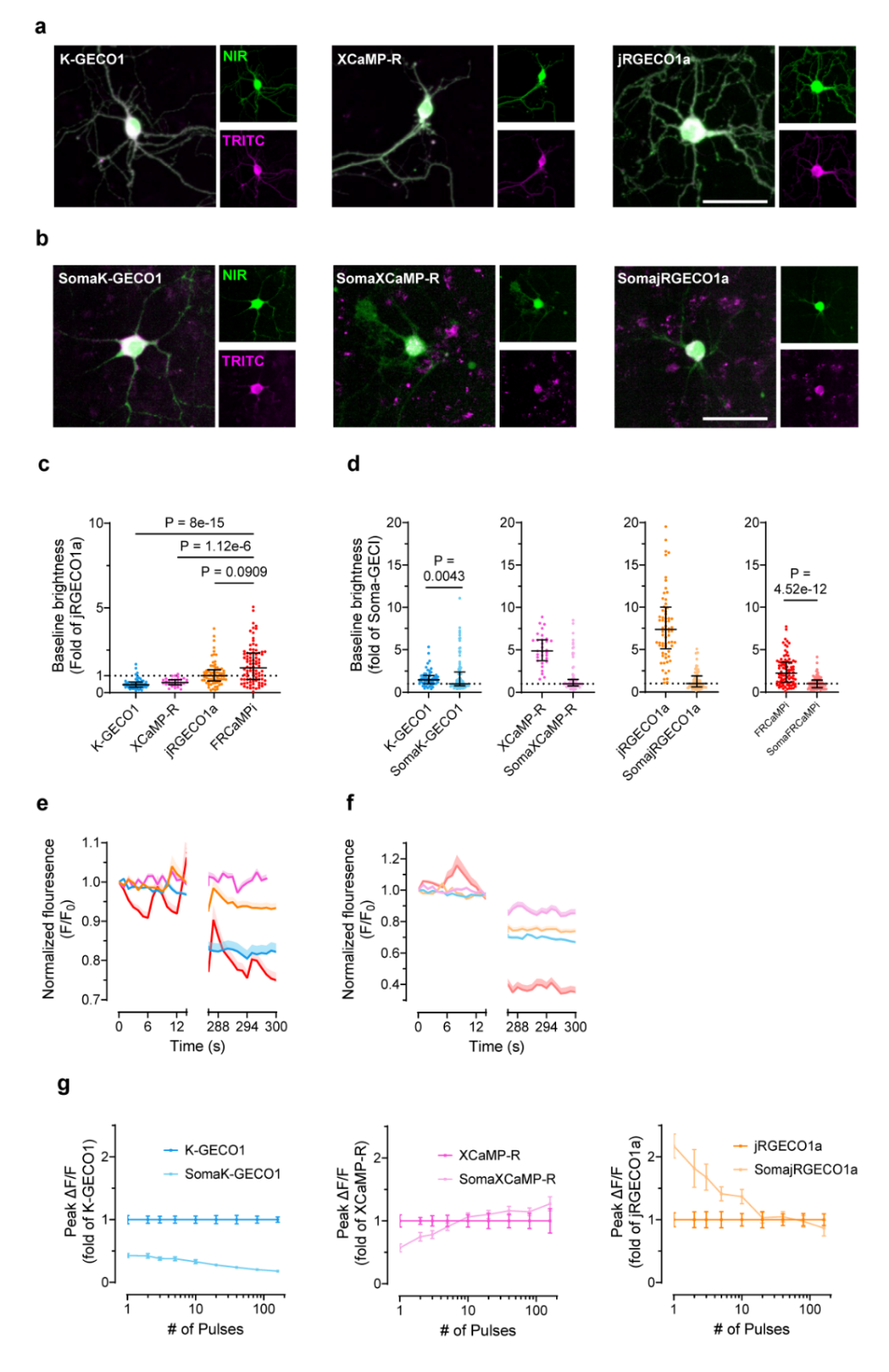 为实现胞体定位并探索目前红色探针经胞体定位后的特性,作者在探针C端添加了由RPL10介导的核糖体定位肽,从而构建了红色靶向细胞体钙指示剂 SomaFRCaMPi。与其他胞体定位版的红色探针相比,SomaFRCaMPi 的灵敏度与动态范围均显著提升,且信噪比在动态范围内至少是其他红色探针的两倍以上。培养神经元实验还显示出 SomaFRCaMPi 具备较高的基线亮度、更低的毒性以及相较于非胞体版本更灵敏的表现。这些结果表明其成为体内神经元钙成像的有力工具,优于其他红色钙指示剂(图3,图4)