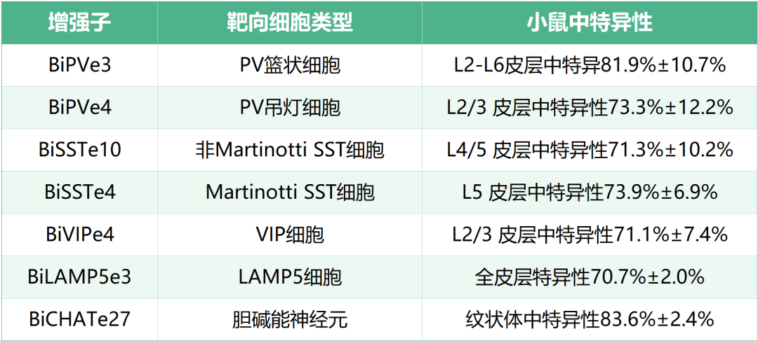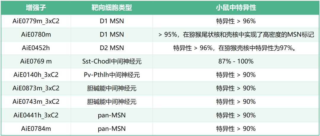 从人类Brain Open Chromatin Atlas(BOCA)和小鼠Cis-element Atlas(CATlas)等公开的ATAC-seq数据中,选择靠近纹状体细胞类型标记基因的候选增强子序列,克隆到AAV载体中,上游连接最小启动子和SYFP2荧光报告基因,用血脑屏障穿透性衣壳PHP.eB包装,RO注射到C57Bl6/J小鼠体内,3-5周后分析表达情况。最终筛选出48个具有良好活性的增强子,覆盖主要纹状体神经元群体,包括20个pan-MSN增强子、5个D1 MSN增强子、7个D2 MSN增强子、5个Sst-Chodl中间神经元增强子、7个胆碱能中间神经元增强子和4个Pvalb-Pthlh中间神经元增强子。