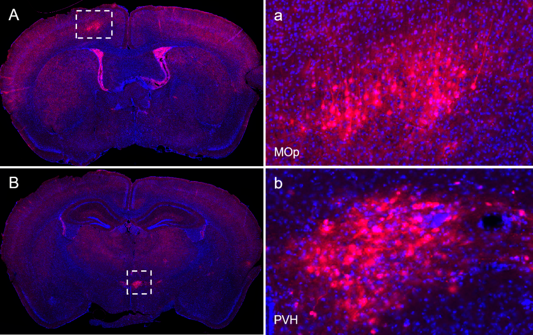 实验中我们常使用嗜神经病毒,对神经环路结构和功能进行追踪分析。其中伪狂犬病病毒(Pseudorabies virus,PRV)被广泛应用于逆行示踪,解析中枢神经系统对外周器官的调控网络。但受其基因表达水平较低和毒性较高的限制,通常需要短时间内取样以避免动物死亡,并通过免疫组化以放大荧光信号,因此给研究带来了不便。