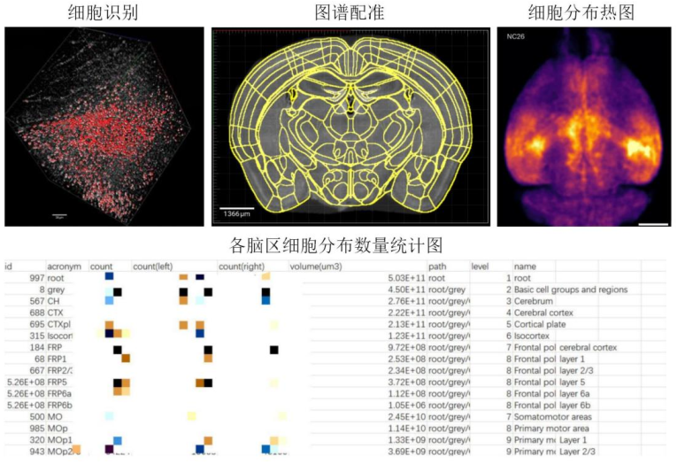 包括全脑细胞检测、图像拼接重建以及与Allen CCFv3图谱的配准,以实现对大脑结构的精确三维重建和分析。