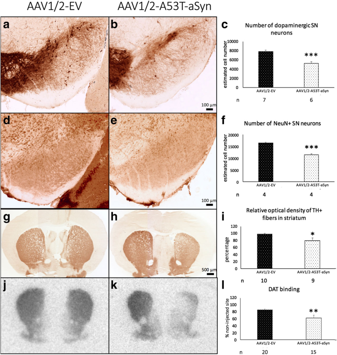 实验结果:以注射AAV1/2-EV的小鼠为对照,注射10周后进行定量分析,结果显示AAV1/2-A53T-α-syn组小鼠同侧黑质中TH +多巴胺能神经元和总神经元数量均显著少于对照组,且同侧纹状体TH + 纤维光密度、突触前DAT水平较对照组分别降低20%和29%。这表明 AAV1/2-A53T-α-syn注射后黑质-纹状体通路发生神经退行性变。