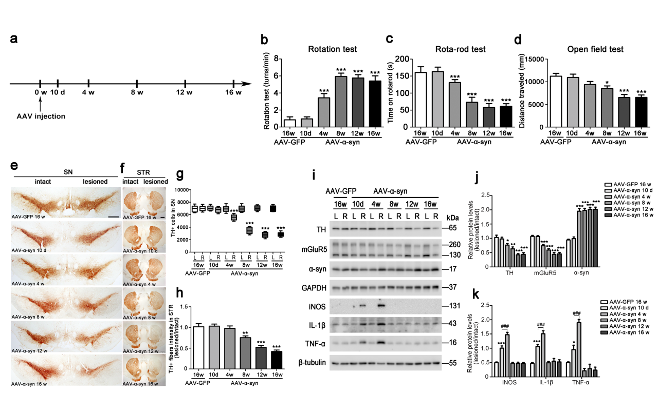实验结果:为明确代谢型谷氨酸受体5(mGluR5)在α-syn诱导小胶质细胞活化中的体内功能及PD模型的炎症反应,研究将AAV-α-syn或对照AAV-GFP注入大鼠右侧黑质,不同时间点检测其行为及病理分析。结果显示α-syn过表达组大鼠从病毒注射8周起出现明显行为障碍并持续至16周,黑质多巴胺神经元也逐渐减少;且α-syn升高、mGluR5降低,小胶质细胞中炎症因子(iNOS、IL-1β、TNF-α)在10天升高、4周达峰、8周后消失。这表明PD病理早期存在反应性小胶质细胞的局部炎症,与既往研究一致。