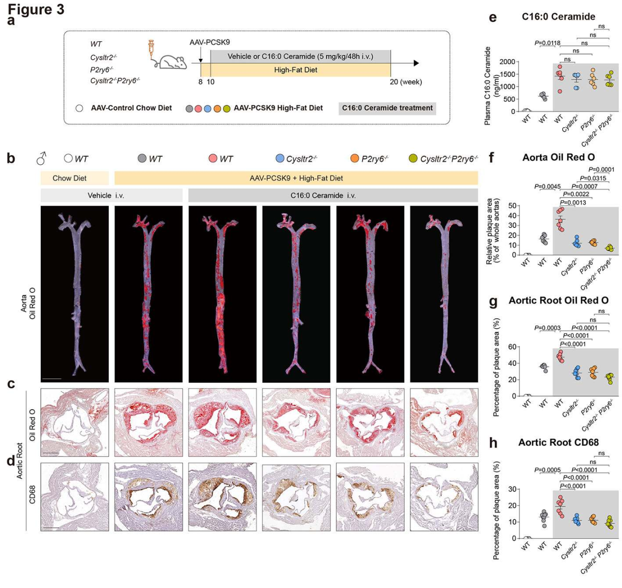 实验结果:为探究CYSLTR2和P2RY6是否介导神经酰胺对动脉粥样硬化的加重作用,实验以8周龄WT、Cysltr2-/-、P2ry6-/-及双敲除小鼠为对象,对其注射 AAV8-hPCSK9-D377Y并饲喂高脂饲料12周,另设WT小鼠注射AAV-Control + 普通饲料为空白组,10周龄起对“AAV-PCSK9 +高脂”小鼠静脉注射 C16:0神经酰胺(5mg/kg/48h)。结果显示,C16:0神经酰胺不影响血脂但使血浆神经酰胺翻倍,显著加剧WT小鼠斑块形成,单敲除小鼠该效应部分减弱,双敲除小鼠斑块、脂质堆积及巨噬浸润进一步减少。CYSLTR2和P2RY6受体可协同介导神经酰胺对动脉粥样硬化的加重作用。