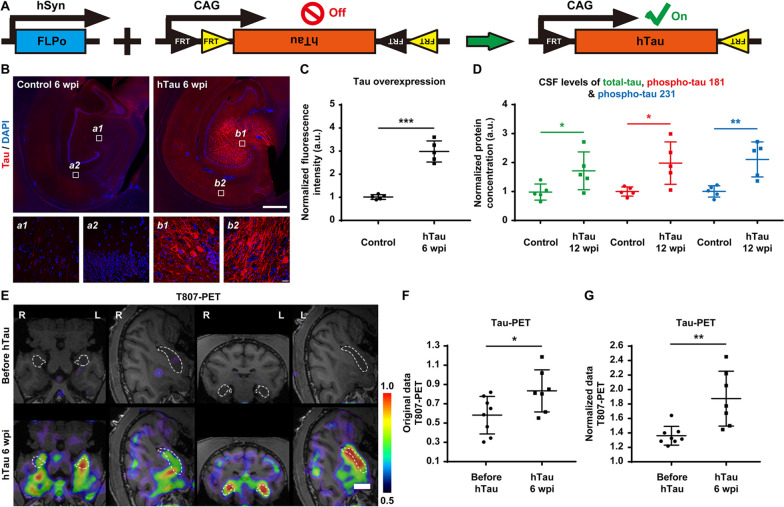 实验结果:为构建Tau蛋白病诱导的、含AD样病理的非人灵长类(NHP)模型,选用成年恒河猴(7-15岁),通过立体定向注射过表达hTau蛋白的AAV载体,使用免疫显色及PET/MRI成像等多种检测方法,结果显示AAV介导的基因转导效率约为75%,且在6至50周内保持稳定,表明AAV能够有效诱导tau蛋白的广泛且持久的表达。