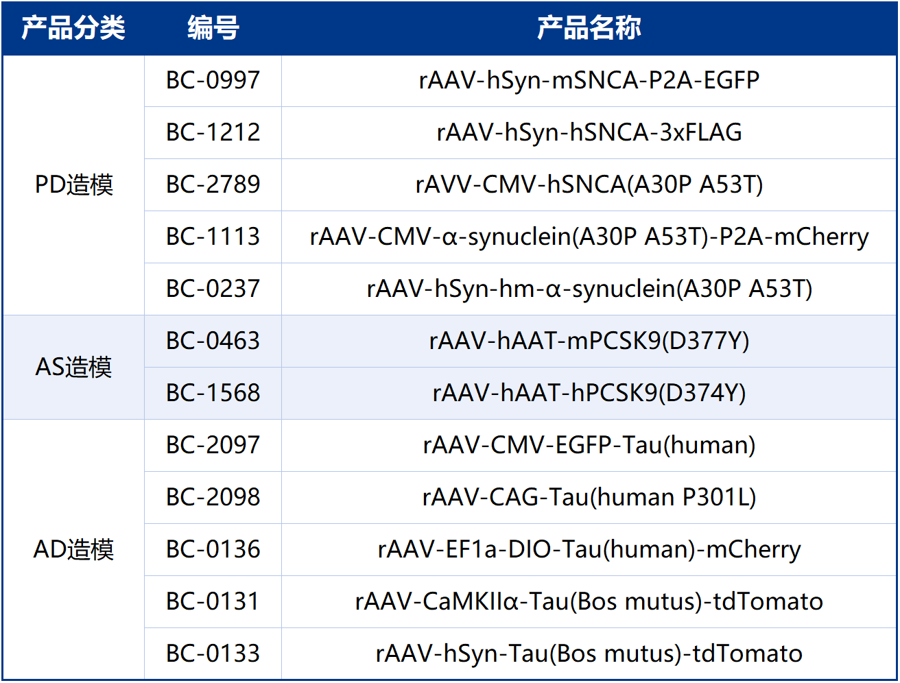 PD是一种常见于中老年人的中枢神经系统退行性疾病,该病主要影响中老年人的神经系统,导致一系列运动和非运动症状。主要病理特征为黑质致密部多巴胺能神经元进行性变性死亡,且残存神经元内出现以α-突触核蛋白(α-syn)异常聚集为主要成分的路易小体和路易神经突。在疾病模型构建中,常用携带α-syn基因(表达野生型或点突变型如A53T)的AAV等作为工具病毒,通过在特定脑区过表达α-syn,模拟其异常聚集及致病过程,从而建立帕金森病相关动物模型。