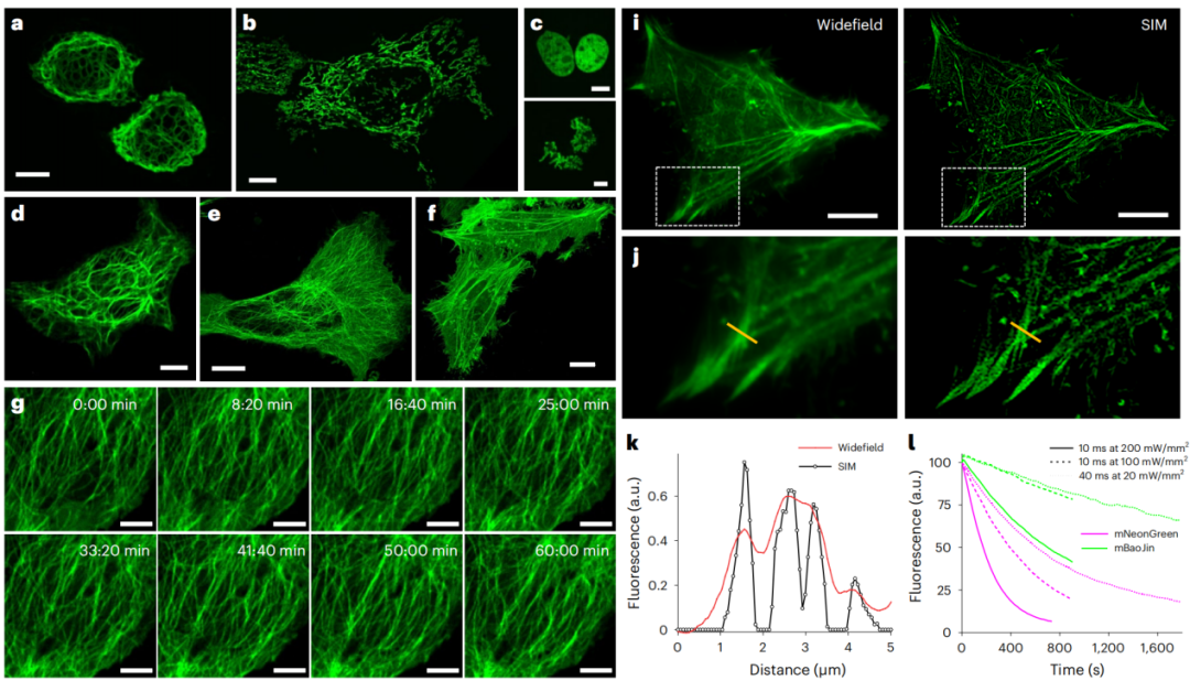 ✅ 超强光稳定性:低激发强度下光稳定性是eGFP的15倍、mNeonGreen的9倍,支持长达60分钟活细胞超分辨成像,光毒性显著降低;