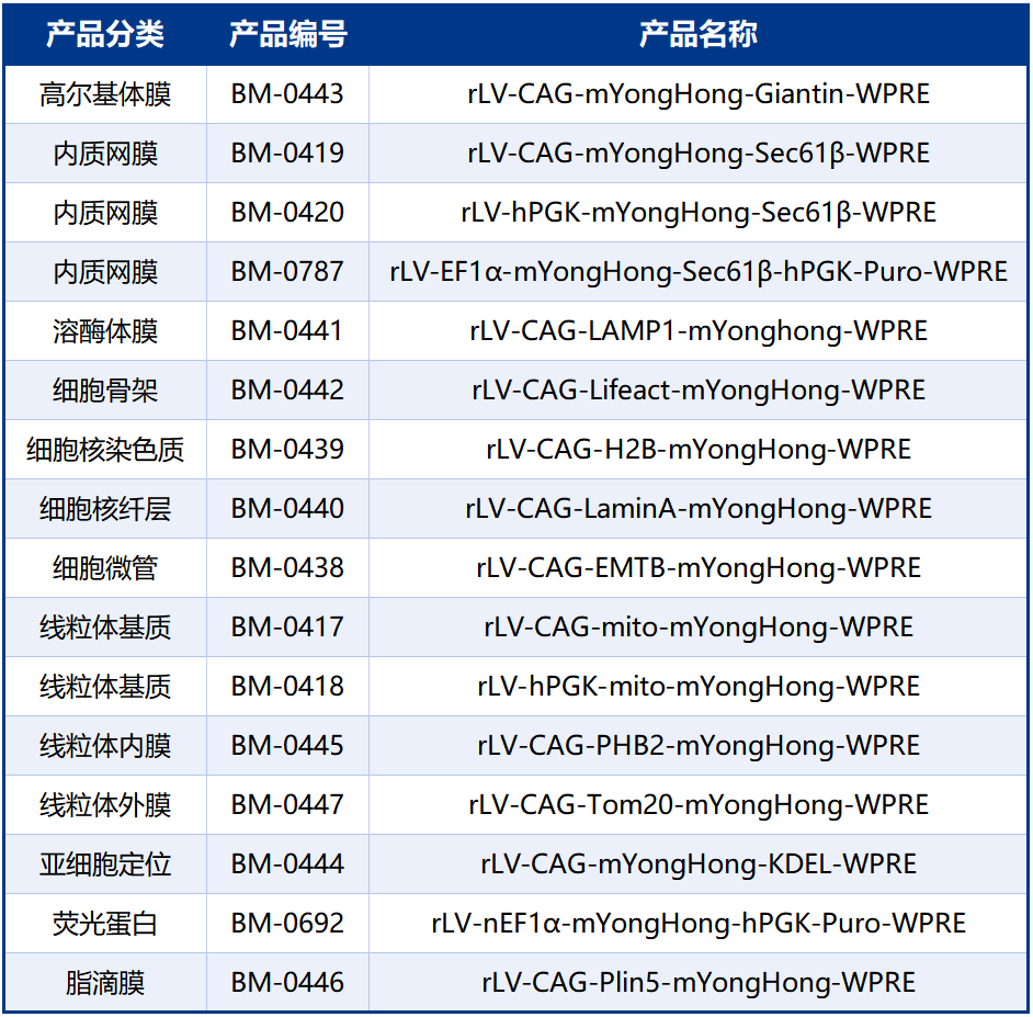 慢病毒(LV):感染谱广,可整合至宿主基因组,实现荧光标记稳定遗传,适合细胞系标记、蛋白表达追踪;