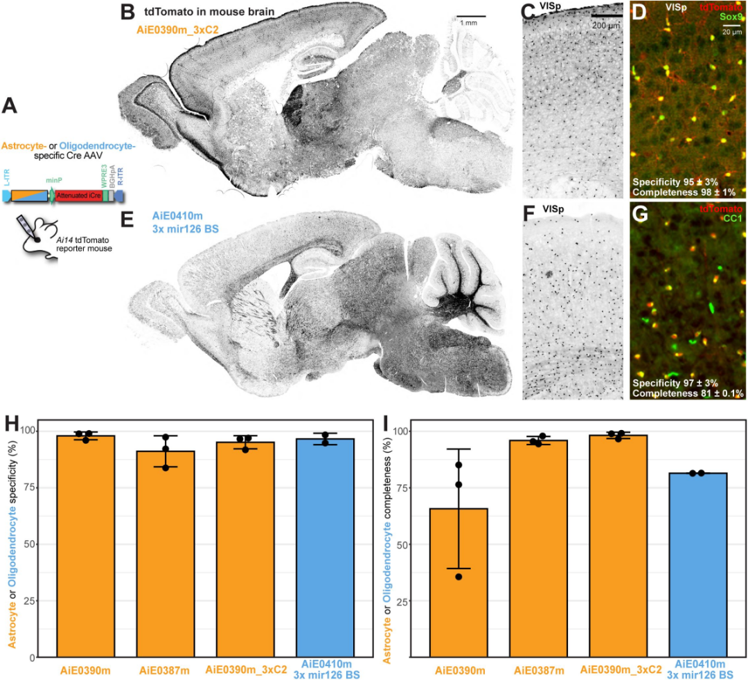 这些工具最突出的优势是特异性极强:绝大多数对目标细胞的特异性超过95%,部分甚至达到99%,远优于传统启动子工具(如GFAP启动子易丢失特异性)。同时表达强度可调节,还能适配不同研究需求——无论是标记全脑胶质细胞,还是靶向特定脑区亚型,都能找到匹配工具。