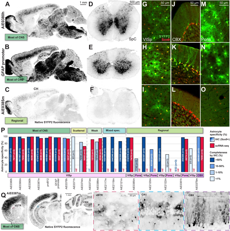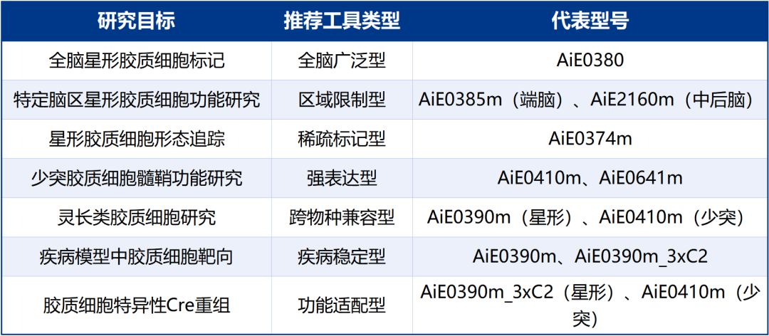 全脑广泛型(如AiE0380h、AiE0387m):标记大脑和脊髓中大部分星形胶质细胞,适合全脑胶质细胞分布测绘。