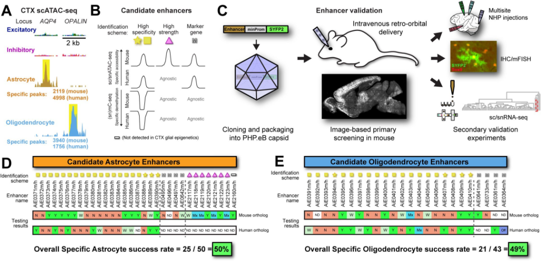 研究团队从人和小鼠的表观遗传数据中筛选候选增强子,通过AAV载体包装和体内验证,最终获得了25种星形胶质细胞特异性增强子AAV和21种少突胶质细胞特异性增强子AAV,筛选成功率接近50%。