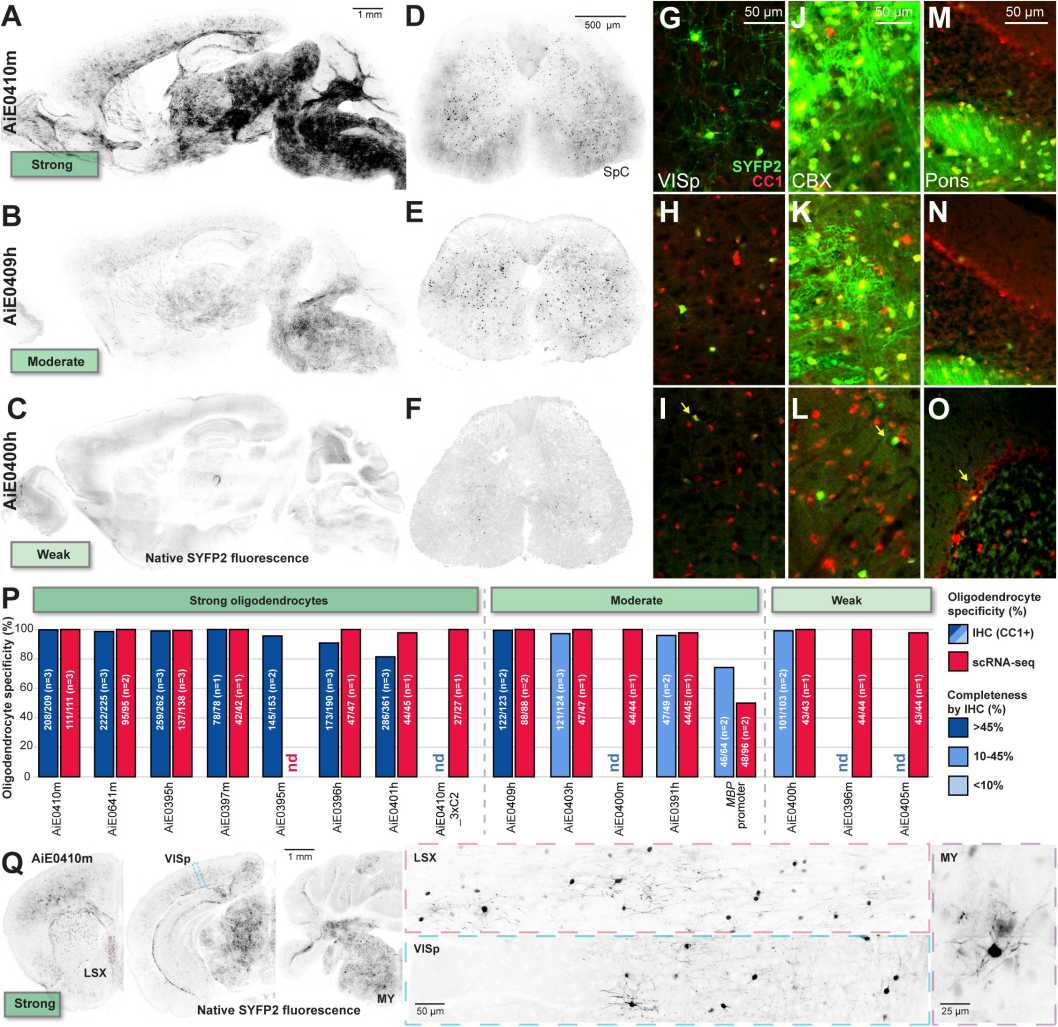 与星形胶质细胞不同,少突胶质细胞增强子AAV无明显区域特异性,全脑灰白质均能表达,核心差异在于表达强度: