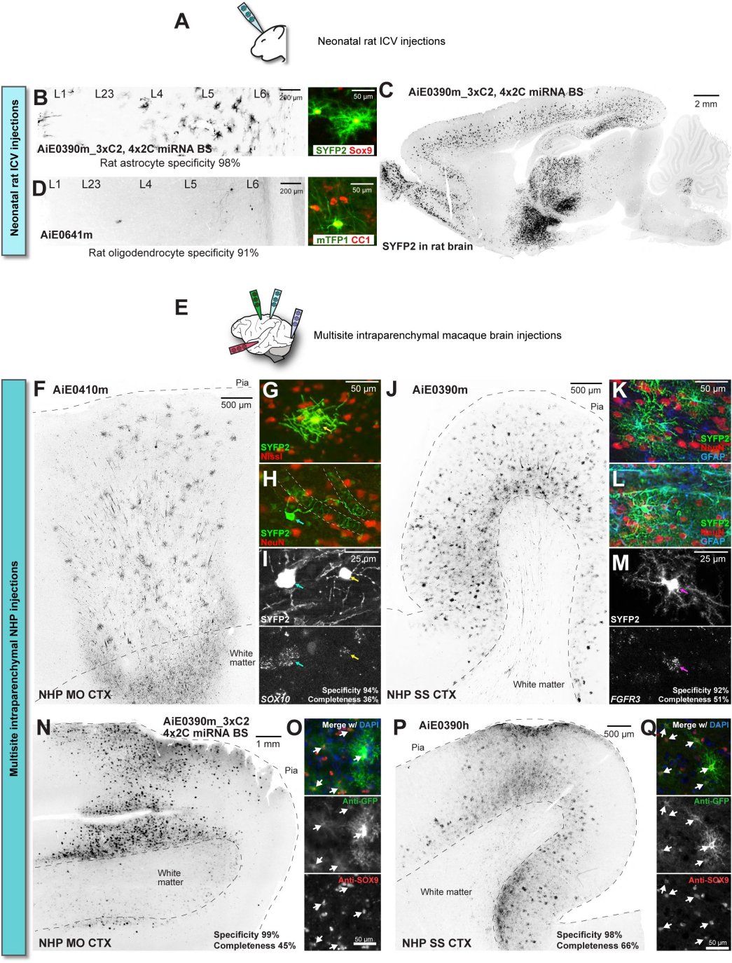 通过颅内脑室注射(ICV)新生大鼠,经优化的AiE0390m_3xC2载体(含 4X2C微小RNA结合位点,可抑制兴奋性神经元中的非靶向表达)对大鼠皮层星形胶质细胞标记特异性 98%,AiE0641m 载体对大鼠皮层少突胶质细胞标记特异性 91%。在豚尾猕猴多脑区实质内注射验证,运动皮层(MO)注射AiE0410m 载体后,皮层柱中观察到成髓鞘少突胶质细胞形态的阳性细胞,高特异性共表达SOX10(94%)。体感皮层(SS)注射AiE0390m载体后,皮层柱中出现大量星形胶质细胞形态的 SYFP2 阳性细胞,这些细胞在脑实质或血管周围共表达GFAP,且高特异性共表达FGFR3(92%)。另一只猕猴MO注射含4X2C位点的AiE0390m_3xC2载体,对SOX9阳性星形胶质细胞标记特异性99%;第三只猕猴实验证实,AiE0390h载体在SS对SOX9阳性星形胶质细胞标记特异性98%。