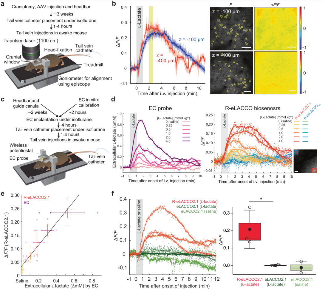 为了验证R-eLACCO2.1体内性能,研究人员向成年小鼠注射编码hSyn-R-eLACCO2.1的AAV,使其在vS1皮层表达(图5a)。已知静脉注射的L-乳酸可穿过血脑屏障,向清醒小鼠尾静脉注射后,通过双光子激光扫描显微镜(AO2P)观察到,100 μm和400 μm深度处R-eLACCO2.1荧光显著升高(图5b)。为了进一步证实其监测胞外L-乳酸动态的能力,研究人员同步记录R-eLACCO2.1荧光信号与体外校准后植入vS1的电化学(EC)L-乳酸探针电信号(图5c-d),结果显示二者信号均随乳酸浓度变化而增减;生理盐水注射会引发R-eLACCO2.1微弱荧光响应,原因未明(图5d)。成像表明,R-eLACCO2.1与EC探针信号高度相关(图5e),证实其胞外L-乳酸探针功能。活体成像中,静脉注射L-乳酸后,R-eLACCO2.1的荧光响应高于GFP基探针eLACCO2.1(图5f)。综上,R-eLACCO2.1作为胞外L-乳酸探针,在体内功能良好。
