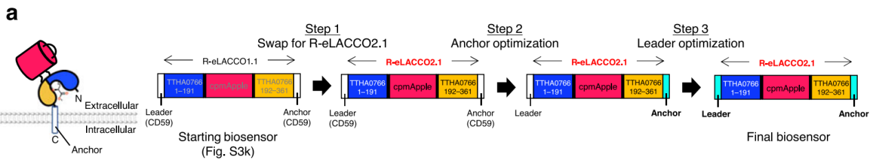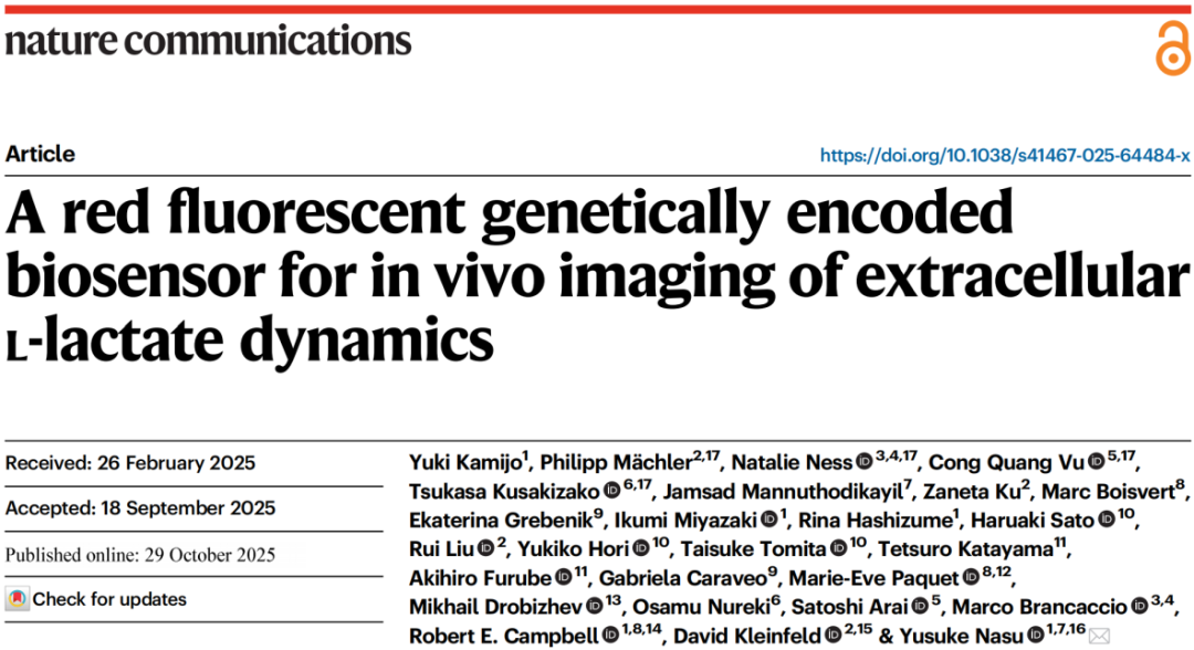 2025年发表于《Nature Communications》的研究文章“A red fluorescent genetically encoded biosensor for in vivo imaging of extracellular L-lactate dynamics”,开发出红色荧光基因编码的细胞外L-乳酸探针R-eLACCO2.1,其通过定向进化优化(从R-eLACCO0.1经多轮进化获得,含25个突变)及Igκ leader与COBRA anchor的膜定位优化,在体内对细胞外L-乳酸升高的敏感性和光谱正交性上优于此前绿色荧光探针。