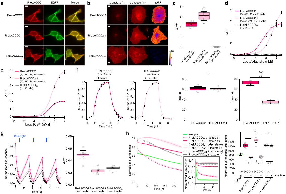 对带优化引导序列(Igκ)和锚定结构域(COBRA)的R-eLACCO2变体进行表征(图2a),HeLa细胞表面表达的R-eLACCO2、R-eLACCO2.1经10 mM L-乳酸处理后,ΔF/F分别为4.5±0.1、6.2±0.2(图2b-c);对照R-deLACCOctrl膜定位正常,但对L-乳酸无响应(图2a-d)。二者对L-乳酸的原位表观Kd分别为560 μM、5.1 mM(图2d),对Ca²+的原位表观Kd为310 μM、610 μM(图2e),均低于脑内胞外Ca²+浓度;结合速率(τon)均为61±5 s/61±3 s,解离速率(τoff)为72±4 s/35±3 s(图2f)。基于cpmApple的探针蓝光下易光激活且光稳定性复杂,HeLa细胞中R-eLACCO变体经470 nm蓝光(~4 mW/cm²)照射,荧光轻微升高(图2g),其光激活ΔF/F远小于乳酸响应,动力学更快(图2c-f)。无乳酸时,R-eLACCO2、R-eLACCO2.1的积分荧光(IF,量化荧光信号的整体强度与稳定性)为1251±18、1485±32,高于mApple;有乳酸时,两者的光稳定性有所下降,IF降至702±5、731±9(图2h);R-deLACCOctrl光稳定性始终高于mApple。