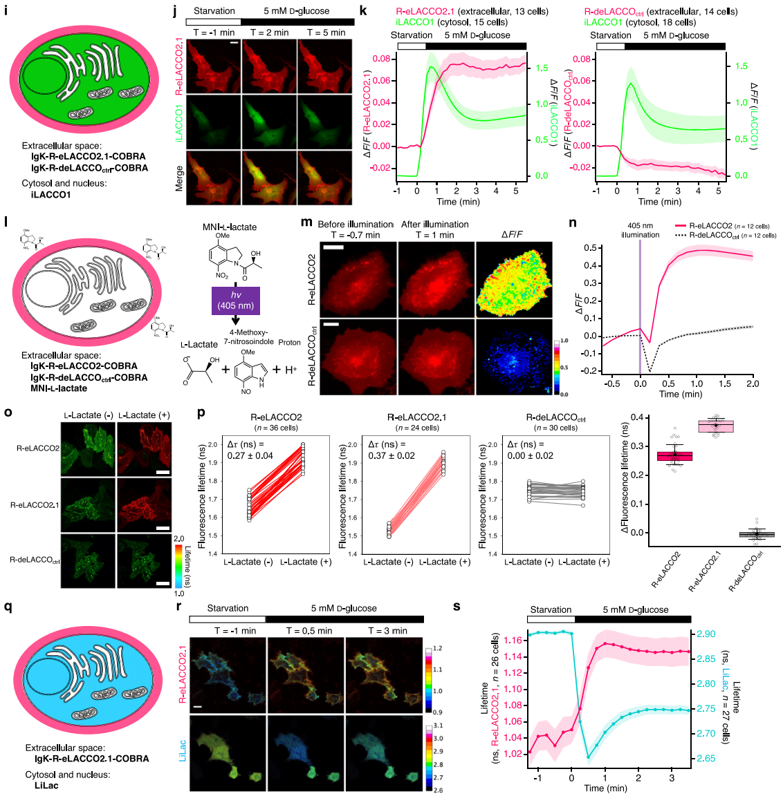 观察L-乳酸时空动态,饥饿胶质母细胞瘤细胞(T98G)共表达R-eLACCO2.1(胞外)与iLACCO1(胞内)(图3i),葡萄糖刺激后二者荧光同步升高(图3j-k),R-deLACCOctrl荧光下降(推测因乳酸升高伴随pH降低,图3k)。HeLa细胞中R-eLACCO2与笼状L-乳酸(MNI-L-乳酸,紫光照射下会释放L-乳酸)共孵育,405 nm光照射后,R-eLACCO2荧光先降(质子释放致pH降低)后升(图3m-n),R-deLACCOctrl仅短暂下降无后续响应,表明其可与绿色荧光探针、紫光激活工具联用。FLIM检测中,HeLa细胞表面的R-eLACCO2、R-eLACCO2.1经10 mM L-乳酸处理,两者的荧光寿命显著延长(图3o-p)。胶质母细胞瘤细胞(T98G)共表达R-eLACCO2.1与LiLac(胞内乳酸FLIM探针),葡萄糖刺激后R-eLACCO2.1荧光寿命如预期升高,LiLac如预期降低(图3q-s),证明其可作为FLIM探针检测活细胞胞外L-乳酸。
