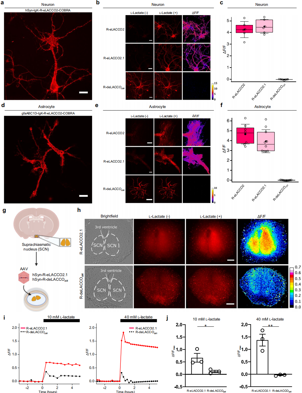 为了验证R-eLACCO2.1检测完整组织乳酸的能力,对AAV介导表达该探针的小鼠脑SCN切片进行检测(图4g),虽然培养基15 mM葡萄糖可能升高基础胞外乳酸,但浴槽加乳酸后,R-eLACCO2.1荧光显著高于R-deLACCOctrl(图4h-j)。综上,带优化引导序列与锚定结构域的R-eLACCO变体,可用于培养神经元、星形胶质细胞表面及脑切片中细胞外L-乳酸的成像检测。