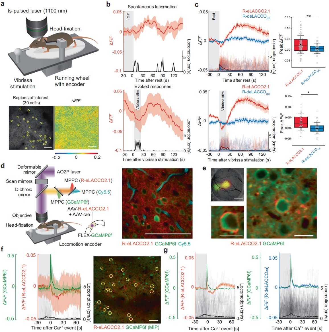 R-eLACCO2.1探针红色荧光可与绿色指示剂(如GCaMP)同时使用,实现“乳酸-神经活动” 多标成像;体内对乳酸升高的响应优于绿色探针,且能检测基线以下的乳酸下降,兼具荧光强度成像与FLIM功能。