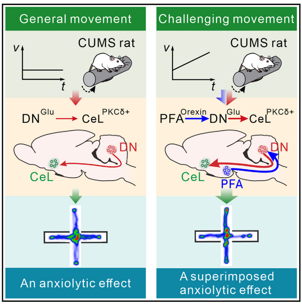 研究人员发现在orexin-cre大鼠下丘脑穹窿周区(PFA)中具有直接支配小脑DN的orexin能神经元,且这些神经元与直接支配杏仁核的orexin能神经元分属不同亚群,进一步兴奋和驱动DN-CeL投射,可以对慢性不可预知温和应激(CUMS)诱导的焦虑模型大鼠产生更强的抗焦虑效应。提示PFA-DN-CeL三元神经环路很可能像多档位变速箱和发动机一样工作,能够在两个强度水平上介导运动对焦虑的改善效应。运用静息态功能磁共振成像(fMRI)技术、离体脑片膜片钳结合光遗传学操控实验、在体光/化学遗传学技术、神经环路示踪技术,以及荧光显微光学切片断层成像技术( fMOST)等神经科学相关技术,在介观尺度上对DN-CeL神经元的直接长时程投射进行重构,在功能和结构上提示小脑与杏仁核之间存在相互作用并与焦虑相关。该项研究成果不仅有助于深入认识小脑的非运动功能,以及运动-情绪互作和机体躯体-非躯体反应整合的神经机制,而且有助于开发更为有效的运动处方,以及靶向小脑的侵入性和非侵入性干预策略,治疗焦虑等情绪情感障碍提供新思路。