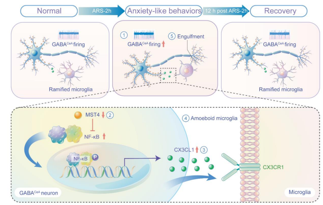 该研究综合运用了在体多通道记录、三维重构技术和化学遗传学等,发现急性束缚应激导致小鼠中央杏仁核CeA中GABACeA能神经元的活性增加,导致12h内的焦虑样行为;同时,通过MST4-NF-κB-CX3CL1信号增加GABACeA神经元CX3CL1分泌,从而激活CeA中的小胶质细胞。活化的小胶质细胞反过来通过吞噬GABACeA神经元树突棘来抑制其活性,最终导致由束缚应激诱导的焦虑样行为的消失。综上,本研究阐释了小胶质细胞吞噬树突棘促进急性应激诱导的焦虑样行为的消失的分子机制。本文的发现拓宽了我们对小胶质细胞驱动的负反馈机制在保护大脑中作用的理解。而且本文发现急性应激早期的小胶质细胞激活可以在调节神经元活动中发挥保护作用,这与以往研究中的慢性应激的促伤害作用不同。