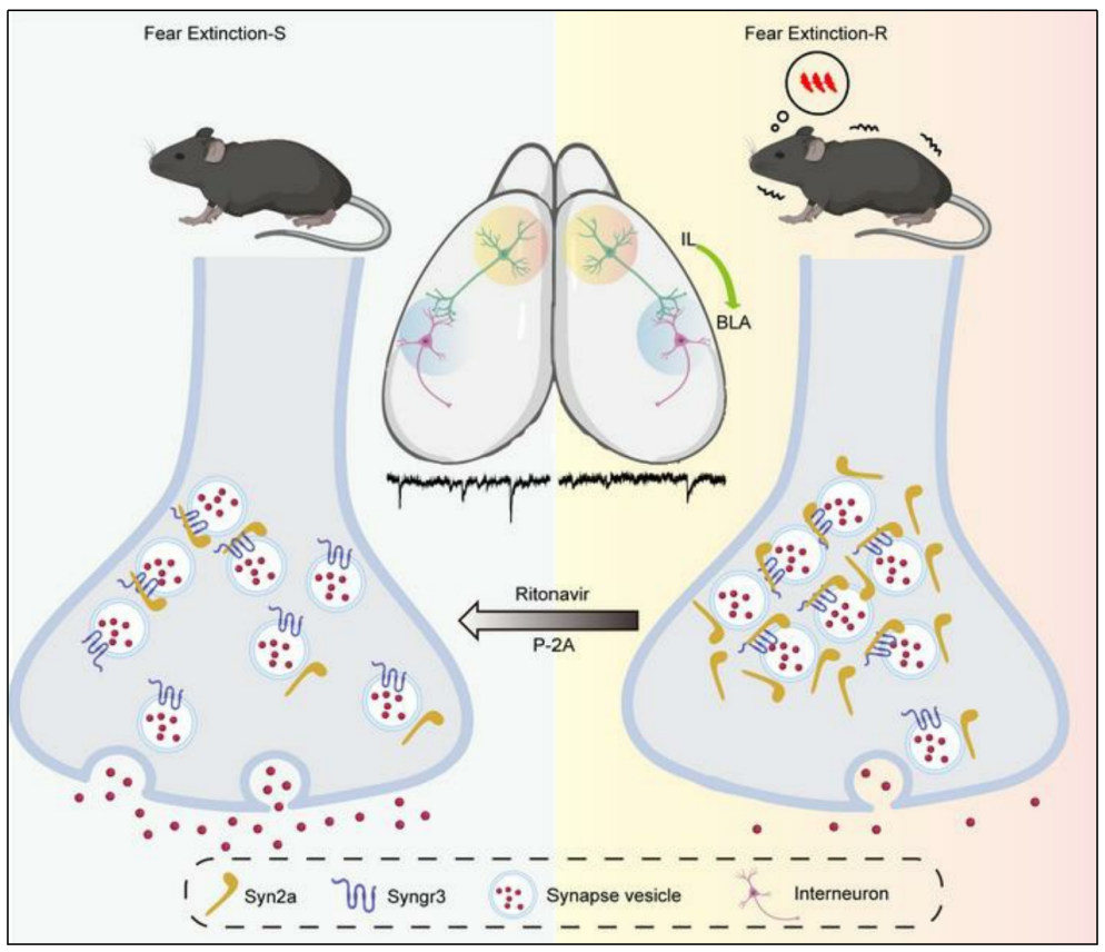 该研究首次发现上调的突触蛋白Synapsin 2a (Syn2a)可通过其特定的H结构域结合Synaptogyrin-3(Syngr3)中的91-99氨基酸,从而导致IL-BLA中间能神经元环路的突触前抑制。透血脑屏障的穿膜肽或FDA批准的抗HIV药物利托那韦能够阻断Syn2a和Syngr3之间的相互作用,从而有效地改善恐惧记忆的消退,为PTSD的治疗提供了崭新的方向。