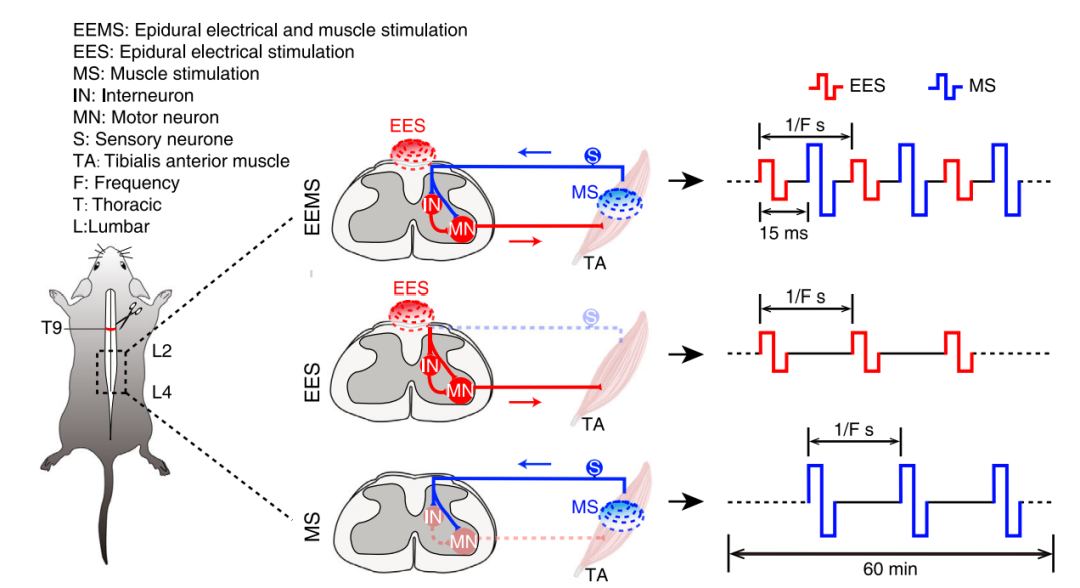 研究人员比较了EEMS,EES和MS对感觉运动神经环路的结构和功能的促进作用,发现仅有在10-20Hz刺激频率条件下的EEMS可以有效恢复感觉运动神经环路的多突触电传导功能,以及后肢的运动功能。通过神经环路示踪,在体电生理记录和光纤记录,研究人员发现10-20Hz的EEMS重塑了脊髓感觉运动神经环路(运动神经元-肌肉间的连接,感觉神经元-运动神经元间的连接,中间神经元-运动神经元间的连接),增强了谷氨酸能神经元对运动神经元的支配。该研究建立了一种脊髓-肌肉界面的双重电刺激系统,模拟脊髓感觉运动神经环路的闭环运行规律,从而在结构和功能水平重建脊髓感觉运动神经环路,使人们对神经调控在神经环路重组中的作用有了更深入的了解,并为中枢神经损伤后的临床治疗提出了一个潜在的框架。