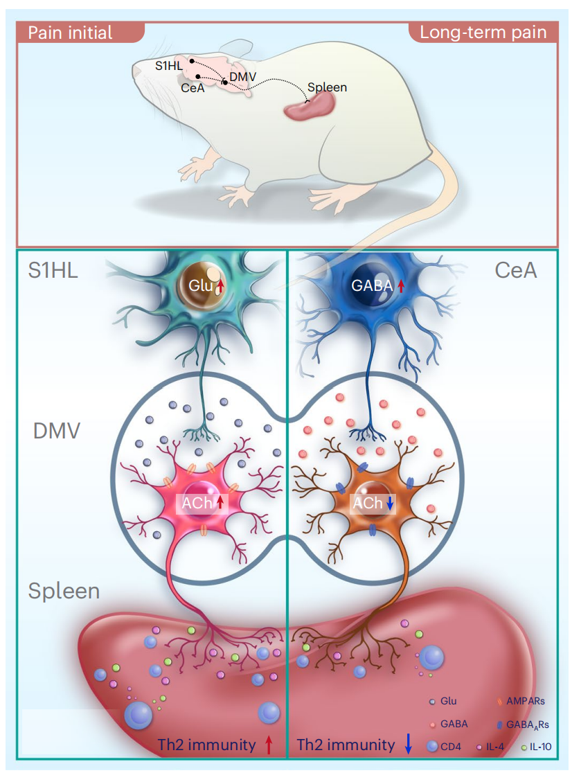 研究人员利用流式细胞术、神经示踪、钙成像技术、膜片钳电生理、光遗传学、化学遗传学等方法,发现脑脾轴调节不同慢性痛模型引起不同类免疫反应。S1HL与AChDMV-spleen形成兴奋性突触联系,促进SNI 1d小鼠TH2免疫反应;CeA与AChDMV-spleen形成抑制性突触联系,抑制SNI 4w小鼠TH2免疫反应。本篇文章发现疼痛介导脾脏TH2免疫反应受两条下行通路调控:一条为S1HL发起的谷氨酸能通路,另一条为CeA发起的GABA能通路,两条通路汇集于DMV乙酰胆碱能神经元,进而调节免疫反应。该研究首次揭示脑脾轴下行调控疼痛引起免疫反应,并阐释其细胞、环路机制,为神经免疫疾病的治疗提供论基础及药物靶点。