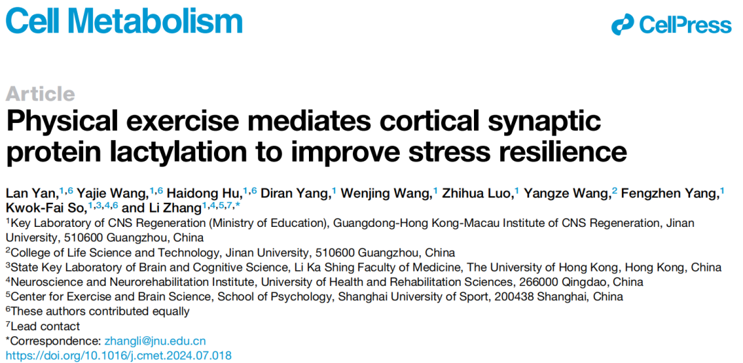 乳酸作为身体在运动训练中的关键代谢物,长期以来被认为与能量代谢紧密相关,而近期的研究则揭示了其在缓解焦虑类疾病中的潜在作用。然而,乳酸如何通过运动介导发挥抗焦虑效应的具体生物学机制尚不完全清晰。2024年8月19日,暨南大学粤港澳中枢神经再生研究院张力课题组,在Cell Metabolism期刊在线发表题为“Physical exercise mediates cortical synaptic protein lactylation to improve stress resilience”的论文,介绍了运动能够显著诱导乳酸化多种突触蛋白,特别是突触体相关蛋白91(SNAP91),这是一种对突触功能至关重要的分子。解剖学证据和体内记录数据表明,SNAP91的乳酸化通过增强内侧前额叶皮层(mPFC)的突触结构形成和神经活动,从而提高了小鼠对慢性束缚应激(CRS)的抵抗力。更有趣的是,运动增强的SNAP91的乳酸化对于预防CRS小鼠的焦虑样行为是必要的。这些结果共同表明,大脑中非组蛋白乳酸化在调节心理功能中的作用,并为大脑在运动范式中的代谢适应提供了证据。