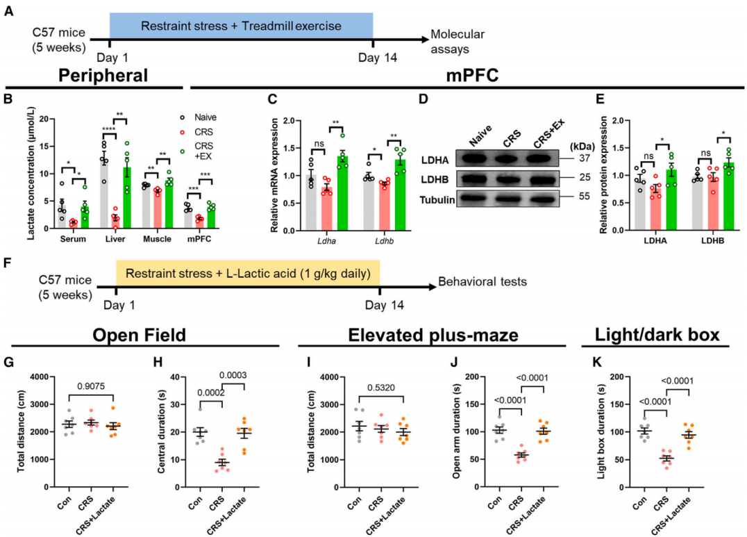 研究使用慢性束缚应激(Chronic Restraint Stress, CRS)的小鼠模型,发现为期14天的跑步机运动(每天1小时,速度为10米/分钟)可以有效预防焦虑样行为的发生。在进行慢性运动后,小鼠的血清、肝脏、肌肉组织以及大脑内侧前额叶皮层(medial prefrontal cortex, mPFC)的乳酸水平均显著提高表达,表明乳酸可能在其中发挥重要作用。研究还发现,运动后mPFC组织中乳酸脱氢酶A/B(LDHA/B)的mRNA和蛋白水平上调,这表明运动训练增强了大脑的乳酸生物合成。通过每日静脉注射L-乳酸代替跑步机运动,研究显示,尽管乳酸处理没有改变小鼠的一般运动活动,但显著减轻了焦虑样行为。此外,使用二氯乙酸(Dichloroacetate, DCA)抑制乳酸生成也显著减弱运动训练的抗焦虑效应。综上所述,乳酸在运动训练中通过增强特定脑区(如mPFC)的乳酸水平,在增强抗压能力、对抗压力和焦虑中发挥着潜在的重要作用。