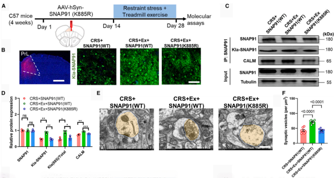 研究指出,定期的体力锻炼能够增强大脑中SNAP91蛋白的乳酸化,这种乳酸化修饰对于防止焦虑样行为的发生是必要的。通过使用特定的突变模型(如SNAP91-K885R),研究者们发现,即使在定期锻炼的情况下,这些突变小鼠的SNAP91乳酸化水平仍然较低,这表明SNAP91的乳酸化对于锻炼诱导的抗焦虑效果是必需的。在携带SNAP91乳酸化位点突变的小鼠中,研究者们观察到突触前膜的突触小泡密度降低,以及突触后密度(PSD)的结构和功能受损。通过在体双光子钙成像技术,研究者们发现,SNAP91乳酸化位点的突变导致了小鼠mPFC的神经活动降低,并且这些小鼠表现出焦虑样行为。研究结果表明,当SNAP91的乳酸化被特异性阻断时,锻炼不再能有效预防或减轻焦虑样行为,这进一步证实了SNAP91乳酸化在锻炼诱导的抗焦虑效应中的关键作用。为了排除过度表达突变SNAP91可能带来的其他因素影响,研究者们还使用了Cas9介导的体内基因编辑模型,通过这种模型直接在小鼠的mPFC中编辑SNAP91基因,结果支持了上述发现。综上所述,SNAP91乳酸化在体力锻炼预防焦虑样行为中的重要作用,并揭示了锻炼可能通过影响特定突触蛋白的乳酸化修饰来改善心理健康。