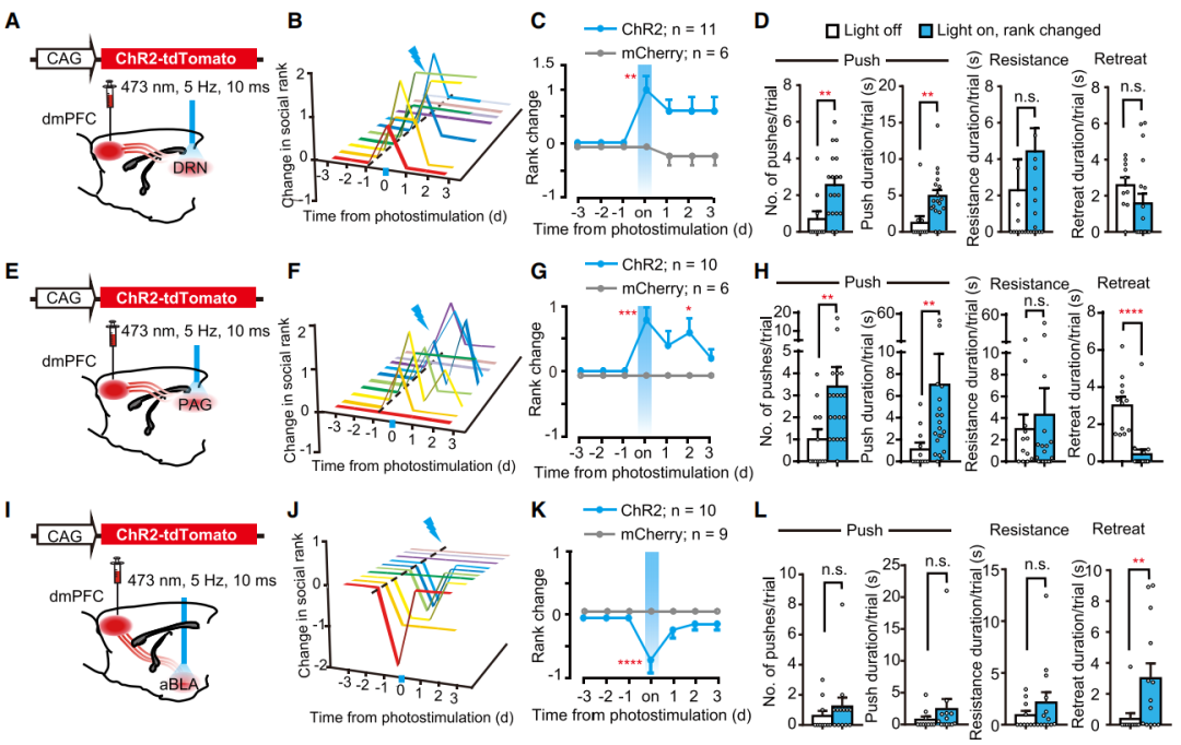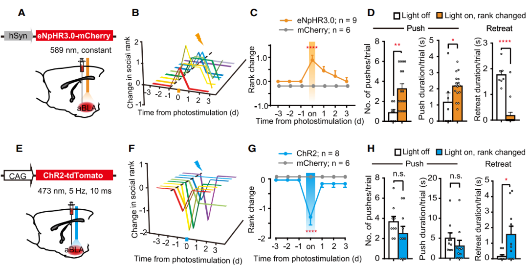 由于dmPFC-aBLA途径在调节社会竞争中显示出了独特的作用,为了进一步确认这一途径的功能,作者接下来尝试在管测试中抑制或激活aBLA本身(图4)。当光遗传学抑制aBLA(图4A)时,发现在管测试中九只小鼠里面有七只显示出更多的推挤行为和更少的撤退行为,并提高了优势等级(图4B-4D)。相反,光遗传学激活aBLA降低了管测试中的等级排名,在八只小鼠中有七只出现了这种情况(图4E-4H)。