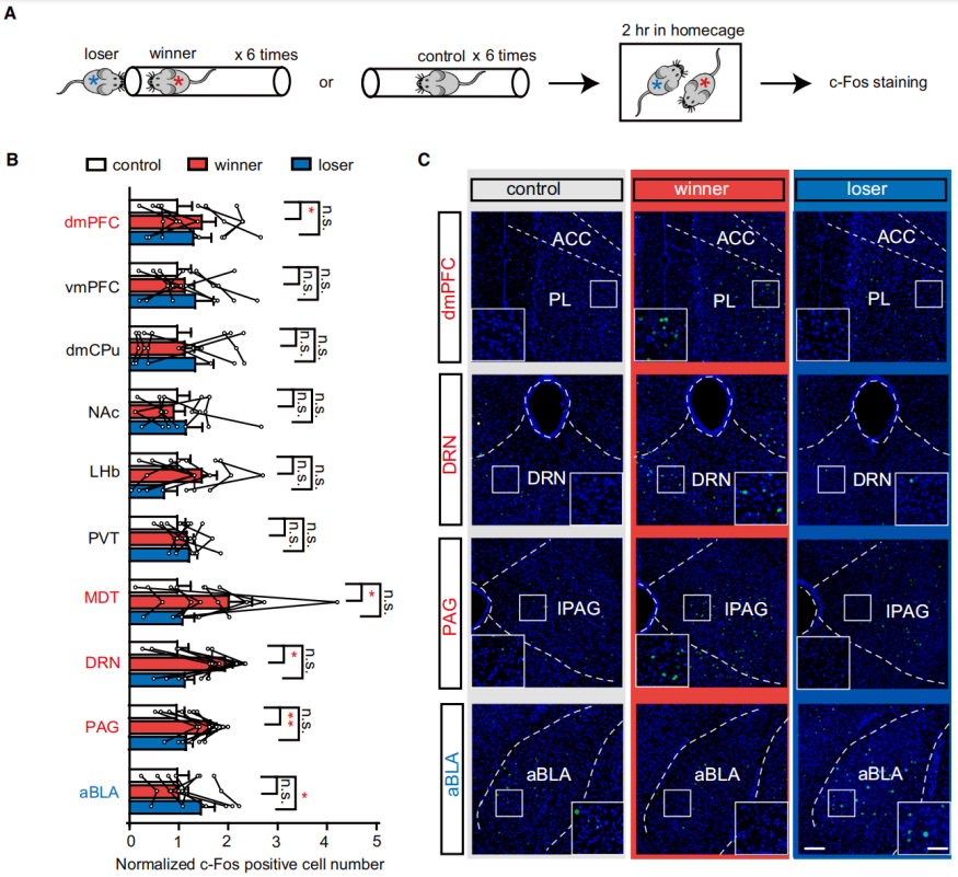 社会竞争是动物间为了确定等级地位而进行的互动,这种地位的确定对动物的行为模式和健康状况有深远的影响。背内侧前额叶皮质(dmPFC)是大脑前额叶的一部分,先前的研究表明它在编码优势地位和竞争成功中起着关键作用。在人类、灵长类动物和啮齿类动物中,dmPFC的活动与个体的社会地位和竞争结果相关联。尽管对dmPFC在社会竞争中的作用有一定的了解,但对于dmPFC如何通过其下游神经环路协调复杂的社会行为,尤其是胜利和失败相关的行为,仍然知之甚少。