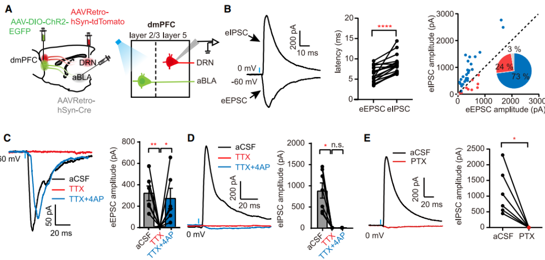 为了理解与失败相关的神经元如何抑制与胜利相关的神经元的细胞机制,作者进行了脑片膜片钳实验(图7)。将表达Cre诱导的光敏感ChR2的AAV注入dmPFC,并将逆行病毒AAV2/2Retro-hSyn-Cre注入aBLA,以在投射到aBLA的神经元中表达带有EGFP标签的ChR2。通过将逆行病毒AAV2/2Retros-hSyn-tdTomato-WPRE-pA注入DRN,使投射到DRN的神经元在红色荧光下可视化。然后使用蓝色光脉冲(5毫秒脉冲宽度)刺激急性脑片中投射到aBLA的神经元,同时使用全细胞膜片钳技术记录投射到DRN的神经元(图7A)。结果发现在大部分(73%)投射到DRN的神经元中,eIPSCs的幅度大于eEPSCs(图7B)。光诱发的EPSCs被电压门控钠通道阻断剂河豚毒素(TTX)完全阻断,并通过应用TTX+4AP(钾通道阻断剂4-氨基吡啶)恢复(图7C),表明eEPSCs是由直接突触连接介导的。另一方面,光诱发的IPSCs也被TTX完全阻断,但通过应用TTX+4AP并未恢复(图7D),表明eIPSCs是多突触抑制性电流。此外,GABAA受体拮抗剂匹克毒素(PTX)阻断了eIPSCs(图7E)。利用光遗传实验对SST-Cre或PV-Cre小鼠相应环路进行调控,结果表明SST和PV中间神经元都参与了dmPFC中从第2/3层到第5层神经元的前反馈抑制。