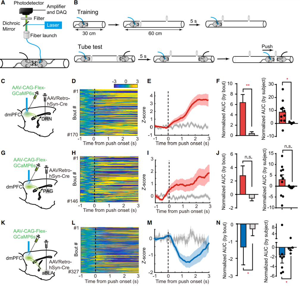 为了测试在社会竞争中不同dmPFC神经元亚群的活动状态,作者使用光纤记录系统实时监测了它们在管测试对抗中的活动(图5A和5B)。将表达Cre诱导的Ca2+指示剂GCaMP6s的AAV注入右侧dmPFC,并将逆行病毒AAV2/2Retro-hSyn-Cre注入DRN、PAG或aBLA。病毒表达后,在dmPFC注射部位上方200毫米处植入光纤以记录Ca2+信号(图5C、5G和5K)。与整个dmPFC的情况类似,投射到DRN的dmPFC神经元的Ca2+信号在推挤行为开始后显著增加(图5D-5F)。投射到PAG的dmPFC神经元的钙信号有增加的趋势,但未达到统计显著性(图5H-5J)。相比之下,投射到aBLA的dmPFC神经元在推挤行为开始后活动减少(图5L-5N)。这种Ca2+动态表明,社会竞争中推挤行为期间,与胜利相关的dmPFC-DRN投射神经元被激活,而与失败相关的dmPFC-aBLA投射神经元被抑制。