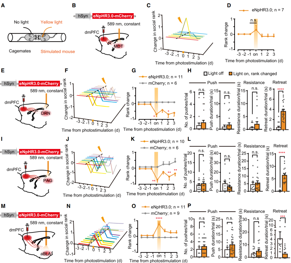 为了确定不同的dmPFC投射在调节社会等级中的功能作用,使用AAV在dmPFC中双侧表达eNpHR3.0来抑制这些途径,在各个下游脑区植入光纤(图2),分别抑制不同的dmPFC投射末端。结果发现光遗传学抑制dmPFC-MDT(图2B-2D)、dmPFC-背内侧尾状核(dmCPu)和dmPFC-NAc环路途径并不影响小鼠管测试中的优势等级排名(dominance rank,衡量个体在社会等级制度中的位置,优势等级高的个体往往能够优先获得食物、配偶和领地,并且在群体中的决策中拥有更大的影响力),而抑制dmPFC-DRN(图2E-2H)或dmPFC-PAG(图2I-2L)会导致更多的撤退行为(图2H和2L)并降低小鼠的优势等级排名(图2G和2K)。相比之下,光遗传学抑制dmPFC-aBLA(图2M-2P)投射途径则减少了撤退行为(图2P)并提高了优势等级排名(图2O)。