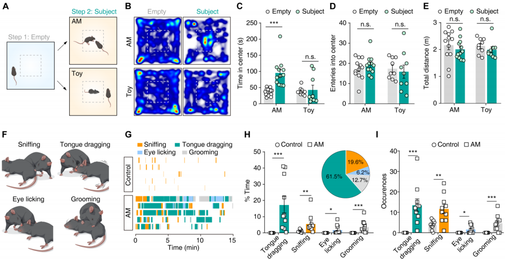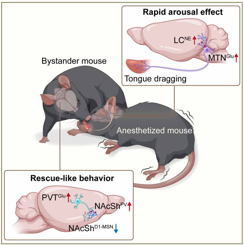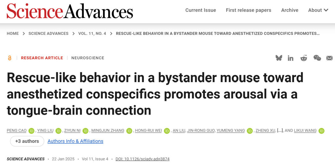 亲社会行为是许多物种生存和繁衍的重要基石。人类和啮齿动物在面对同伴的困境时,常常会表现出安慰、帮助、合作等行为。这种行为背后的动机是什么?仅仅是共情吗?还是有其他因素在起作用? 在麻醉状态下,疼痛刺激能够促进苏醒。在中医急救中,按压或针刺面部人中穴位可以唤醒昏厥或麻醉的人。这种基于身体刺激的急救行为,是否在小鼠中也存在呢?2025年1月22日,中国科学技术大学张智与安徽医科大学陶文娟、王立奎联合在Science Advances上发表题为“Rescue-like behavior in a bystander mouse towards anesthetized conspecifics promotes arousal via a tongue-brain connection”的突破性研究,揭示了小鼠的“救援行为”及其背后的神经机制。小鼠也有“救援队”?“拖拽舌头”行为背后的秘密 研究团队发现,当小鼠的同伴处于麻醉状态时,旁观者小鼠会表现出一种特殊的“救援行为”——拖拽同伴的舌头。这种行为不仅看起来很“贴心”,而且真的能帮助麻醉的同伴更快苏醒!这一发现刷新了我们对小鼠社交行为的认知。图1:旁观者小鼠对麻醉同伴表现出特殊的救援行为——“拖拽舌头”