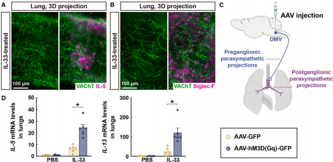 为了研究了餐后副交感神经信号是否会调节肺部2型免疫。副交感神经系统由神经节前投射,如来自DMV的投射,以及副交感神经节及其在外周组织中的神经节后神经支配组成。节前和节后副交感神经成分都是胆碱能的。利用全脑免疫标记和3D成像等技术全面检查了肺的副交感神经解剖学。此外,通过对VAChT(囊泡乙酰胆碱转运蛋白)和IL-5(由ILC2s产生的2型细胞因子)进行共免疫标记和3D成像,揭示了IL-33处理小鼠肺组织中副交感神经节后纤维与2型免疫反应的空间关联(图3A)。通过3D成像检测嗜酸性粒细胞的特异性标记物Siglec-F,发现IL-33诱导的嗜酸性粒细胞募集也与这些VAChT阳性神经纤维在空间上相关(图3B)。这些解剖学评估支持了副交感神经信号可能影响肺部2型免疫的可能性。因此,作者采用了化学遗传学方法来模拟进食诱导的副交感神经激活。小鼠DMV注射表达hM3D(Gq)的AAV病毒(图3C),与对照小鼠相比,接受AAV-hM3D(Gq)注射的小鼠在CNO处理后,其肺部IL-33诱导的2型细胞因子的mRNA水平显著提高(图3D)。