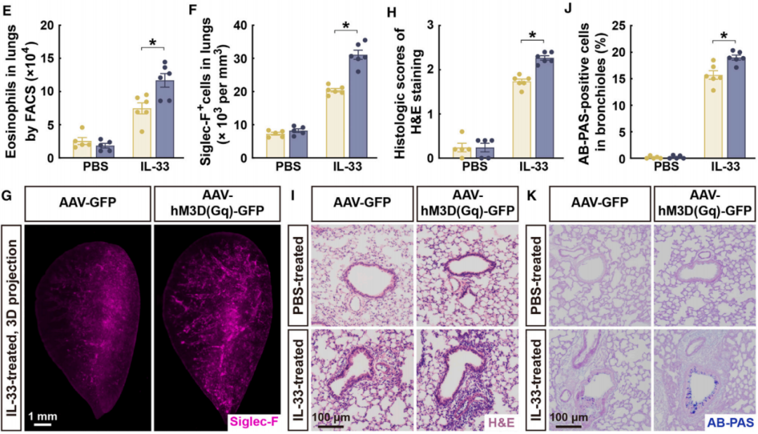 荧光激活细胞分选(FACS)分析显示,在接受AAV-hM3D(Gq)注射的小鼠中,IL-33处理的肺部积累了更多的嗜酸性粒细胞(图4E)。这种嗜酸性粒细胞的增加可以通过对Siglec-F阳性免疫细胞的3D成像来验证(图4F和4G)。此外,通过苏木精-伊红(H&E)染色(图4H和4I)或阿辛蓝-过碘酸雪夫(AB-PAS)染色(图4J和4K)检查的肺部病理变化,因副交感神经信号的化学遗传激活而加剧。值得注意的是,之前的研究表明CNO对野生型小鼠的肺部ILC2s没有影响。此外,在PBS处理的对照条件下,CNO并未引起AAV-hM3D(Gq)注射小鼠的任何可检测的肺部炎症,从而排除了这种化学遗传配体的非特异性作用(图4H-4K)。这些结果表明,源自DMV的副交感神经信号足以增强肺部2型免疫反应。