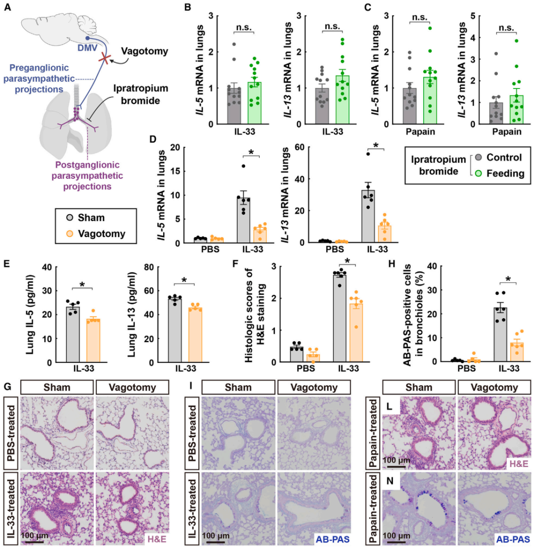 随后,研究团队探讨了阻断肺部副交感神经信号的效果。首先,通过鼻内给予毒蕈碱型胆碱能受体拮抗剂——溴化异丙托品,对小鼠进行处理(图5A)。这种对局部副交感神经信号的药理学阻断能够使IL-33诱导的2型细胞因子表达恢复正常水平,否则这些细胞因子会在进食后增加(图5B)。类似地,溴化异丙托品也消除了进食诱导的对木瓜蛋白酶的2型免疫反应增强(图5C)。接下来,采用迷走神经切断术(vagotomy)这种外科手术方法来阻断节前副交感神经输入(图5A)。正如预期的那样,这种手术操作并未影响肺部节后副交感神经纤维的存在。迷走神经切断术显著降低了IL-33诱导的IL-5和IL-13的表达,这一点通过qPCR分析(图5D)和ELISA(图5E)得到了证实。相应地,通过H&E染色(图5F和5G)或AB-PAS染色(图5H和5I)观察到,手术阻断节前副交感神经信号减轻了肺部病理变化。值得注意的是,与接受假手术的小鼠相比,接受PBS处理的迷走神经切断术小鼠并未显示出可检测的肺部炎症(图5F-5I)。与此同时,木瓜蛋白酶诱导的2型细胞因子表达和组织病理变化在迷走神经切断术小鼠的肺部也显著降低。此外,作者在小鼠DMV注射表达hM4D(Gi)的AAV病毒,有效地减少了IL-33处理的小鼠进食后肺组织中2型细胞因子和嗜酸性粒细胞招募的增强。