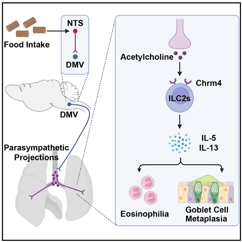 肺部是人体的重要免疫屏障,持续面临空气中的病原体或过敏原的挑战。2型免疫反应在维持肺部屏障功能和抵御真菌或寄生虫感染中起关键作用,功能失调可能导致过敏性疾病,如哮喘。哮喘患者的症状常在进食后加重,但其背后的病理生理机制尚不完全清楚。肺部不仅存在丰富的免疫细胞,还受到来自感觉神经、交感神经和副交感神经的广泛调控。越来越多的证据表明,神经信号对2型天然淋巴细胞(ILC2s)等免疫细胞具有重要的调节作用。因此,进食后副交感神经信号对肺部2型免疫反应的潜在影响值得深入研究。