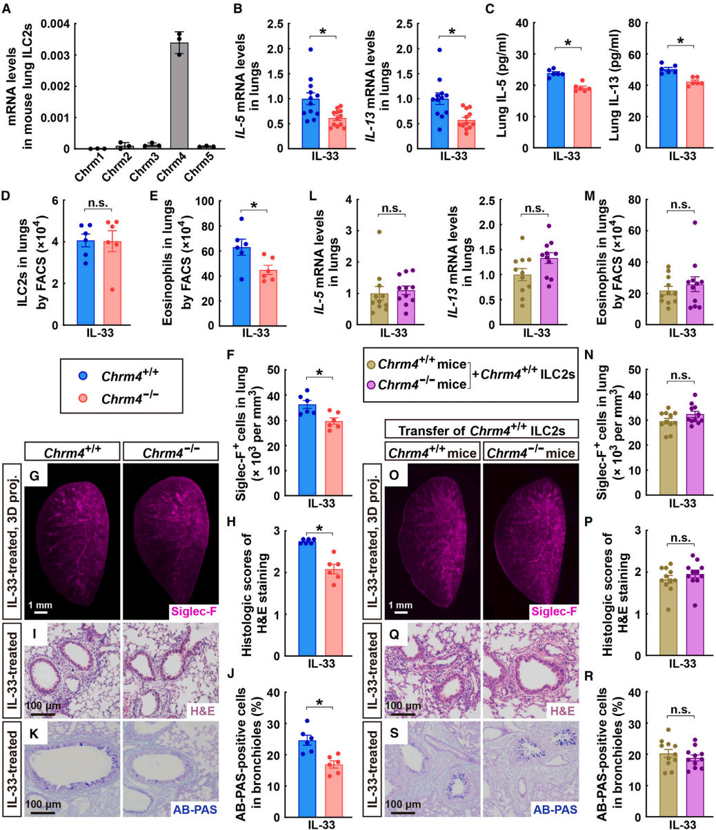 为了验证Chrm4在ILC2s中的免疫调节作用,作者构建了一种嵌合鼠,使用携带CD90.2的Chrm4⁺/⁺和Chrm4⁻/⁻同窝小鼠作为实验对象,通过抗CD90.2抗体介导的方法清除小鼠CD90.2阳性的ILC2细胞。将CD90.1+野生型肺ILC2s(这些细胞对CD90.2抗体具有抵抗力)转移到ILC2细胞被清除的小鼠体内。通过这种方式,嵌合鼠体内保留了来自供体的ILC2细胞,同时原有的ILC2细胞被清除。这种设计能够在嵌合鼠中特异性地研究ILC2的功能,而不受其他类型细胞的影响。在用IL-33(图6L)或木瓜蛋白酶处理后,两种嵌合小鼠(Chrm4⁻/⁻和Chrm4⁺/⁺)的肺组织中2型细胞因子的表达水平相似,嗜酸性粒细胞募集没有显著差异(图6M-6O),肺部病理反应也相似(图6P-6S)。